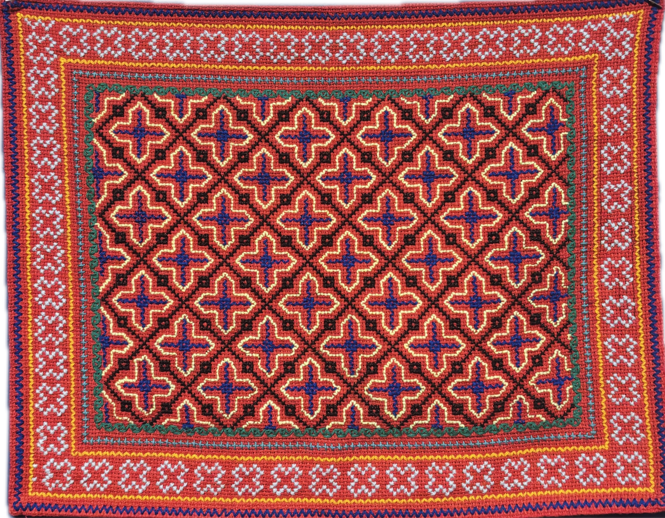 This one of a kind embroidered and woven song cloth was handmade and designed by the Shipibo Conibo, who live in Peru, in the Ucayali River basin, a feeder for the Amazon River.