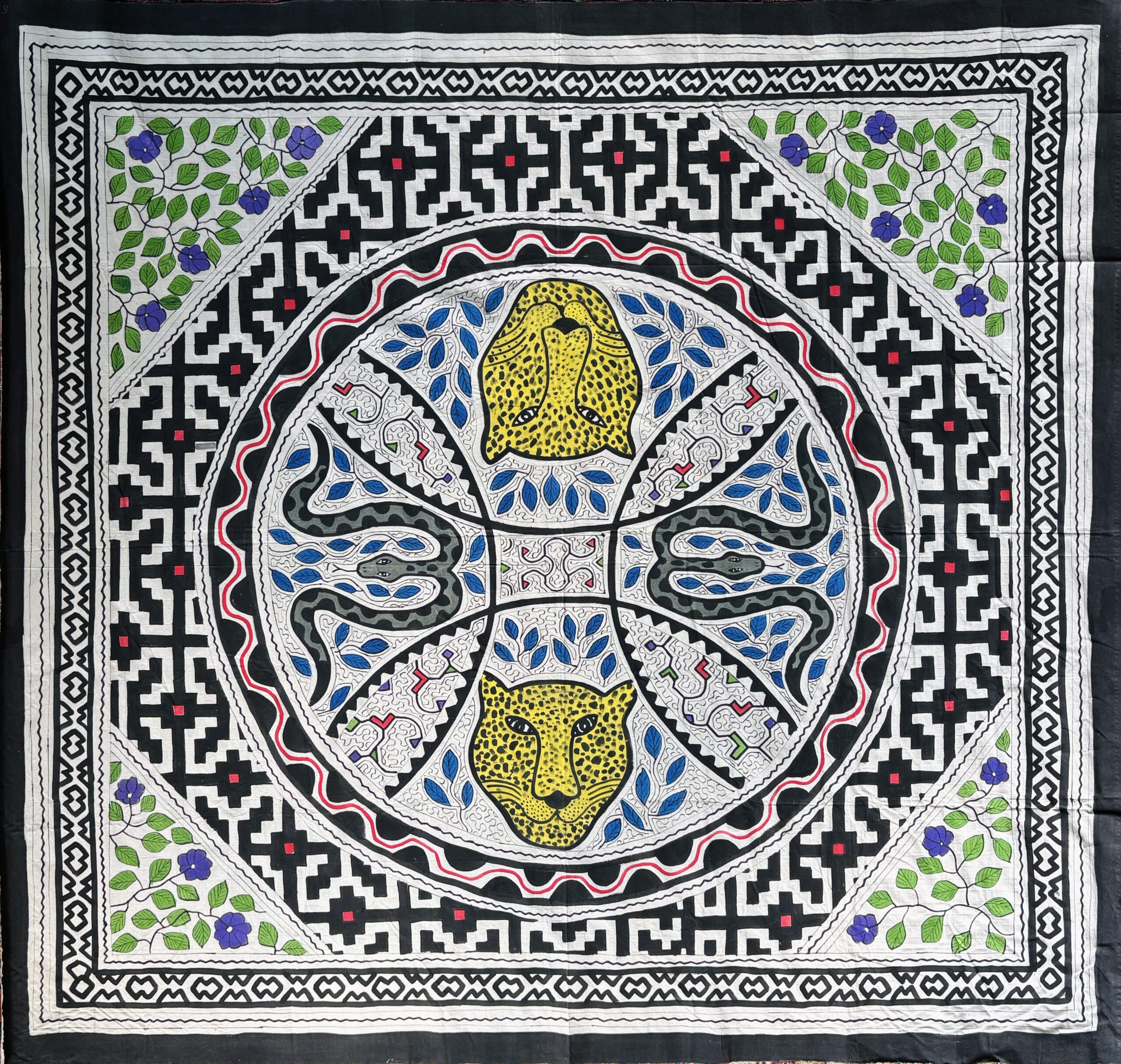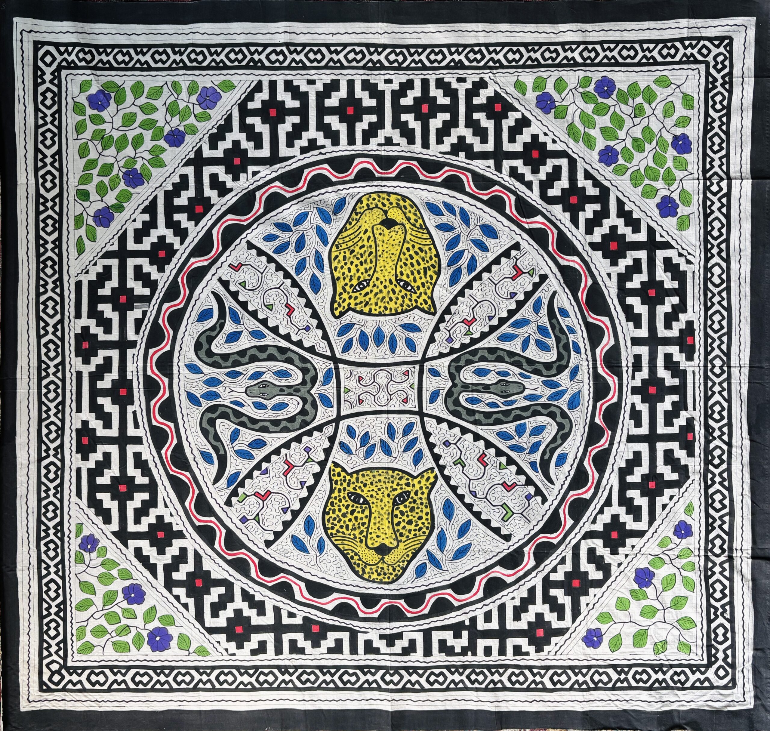 This one of a kind song cloth was handmade and designed by the Shipibo Conibo, who live in Peru, in the Ucayali River basin, a feeder for the Amazon River.