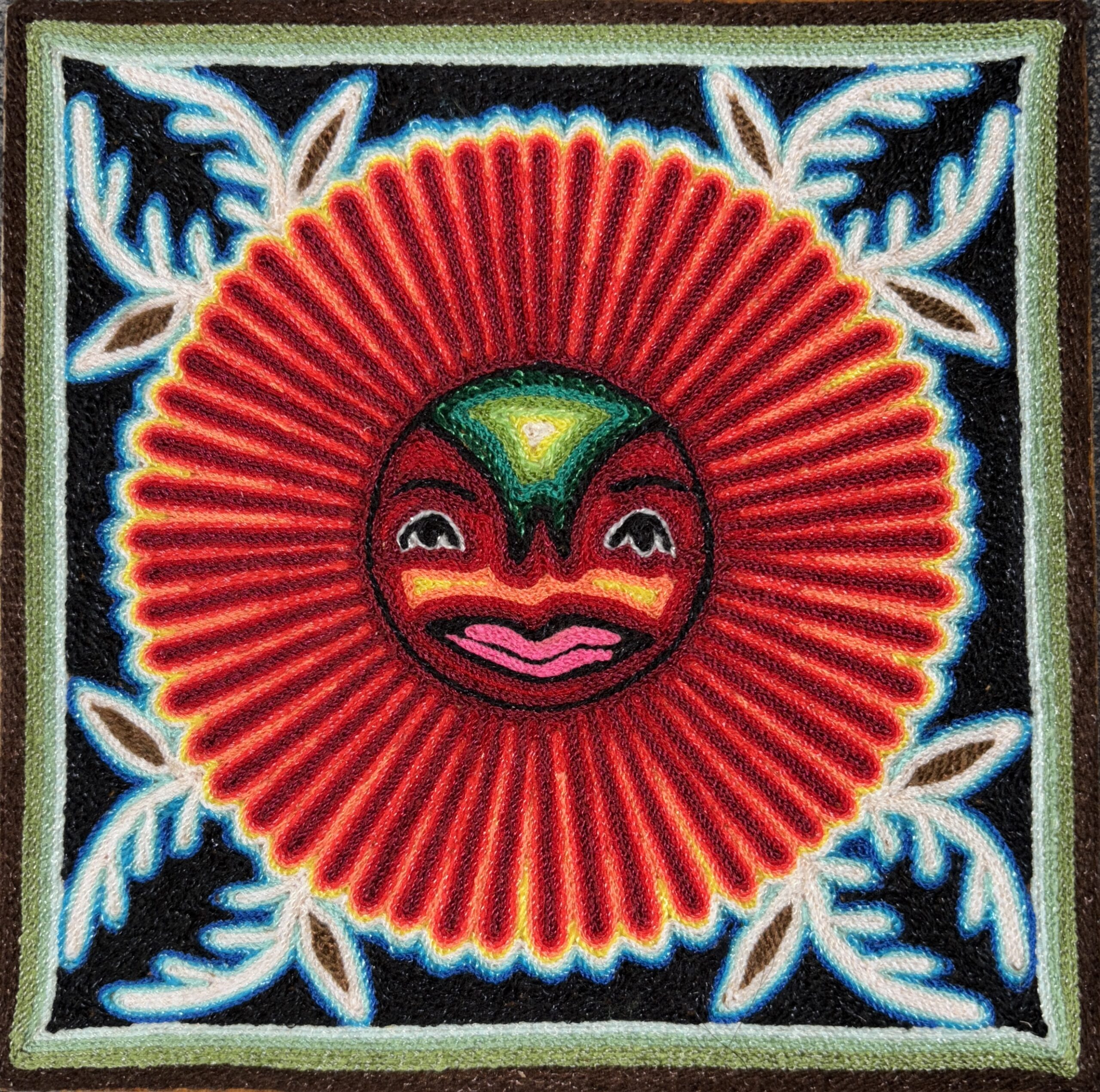 This Wixarika Huichol yarn painting is made in the San Luis Potosi region of Mexico, in Real de Catorce, a mountain town above Wirrikuta, the Peyote Gardens. This piece is unique and made by hand pressing individual threads on to a wax covered shape.