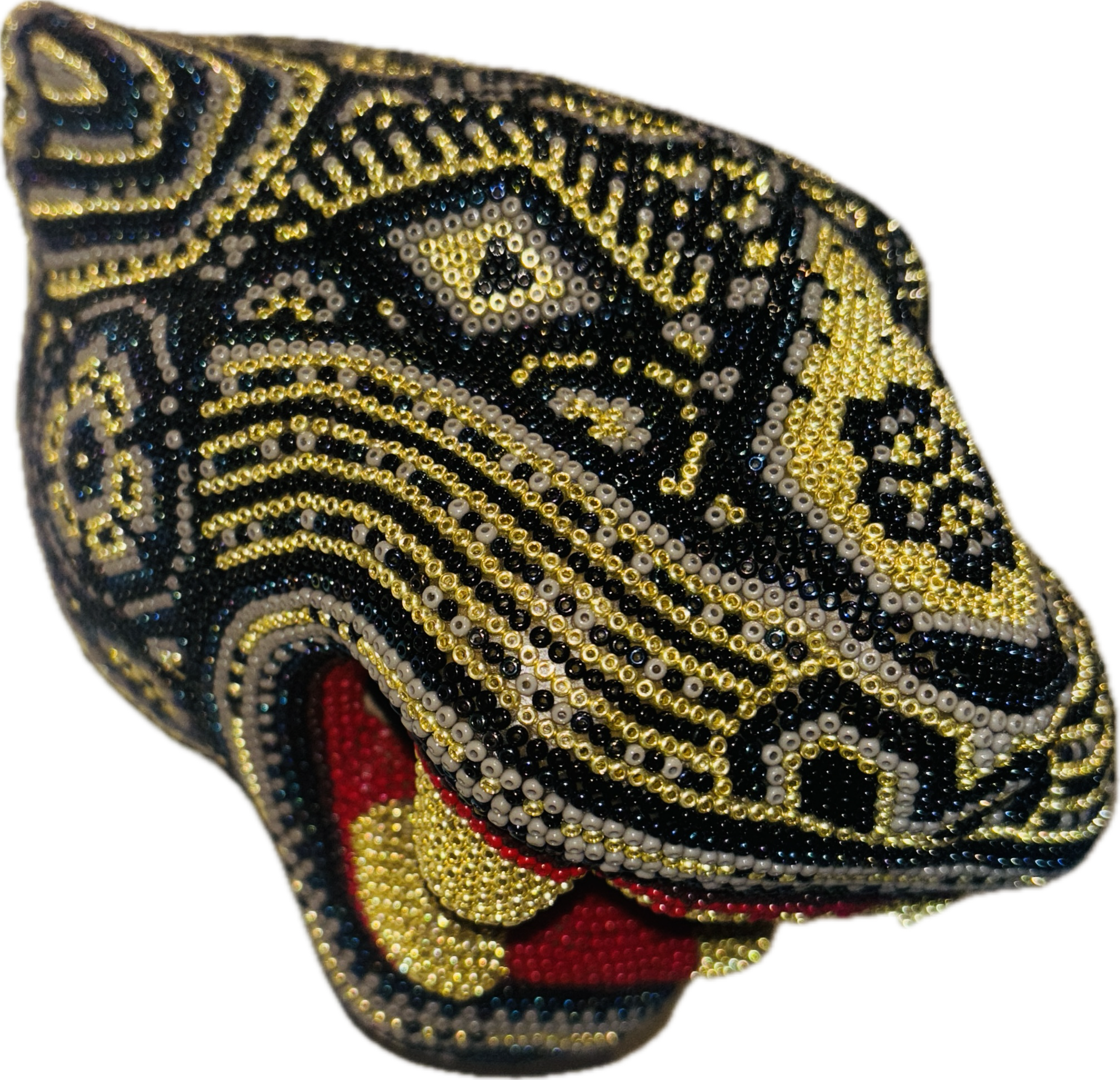 This Wixarika Huihcol exquisite piece is intricately adorned with beads. Made by Wixarika artist Gustavo Nierika in the San Luis Potosi region of Mexico, in Real de Catorce, a mountain town above Wirrikuta, the Peyote Gardens, this jaguar is unique and made by hand pressing individual beads on to a wax covered mould.