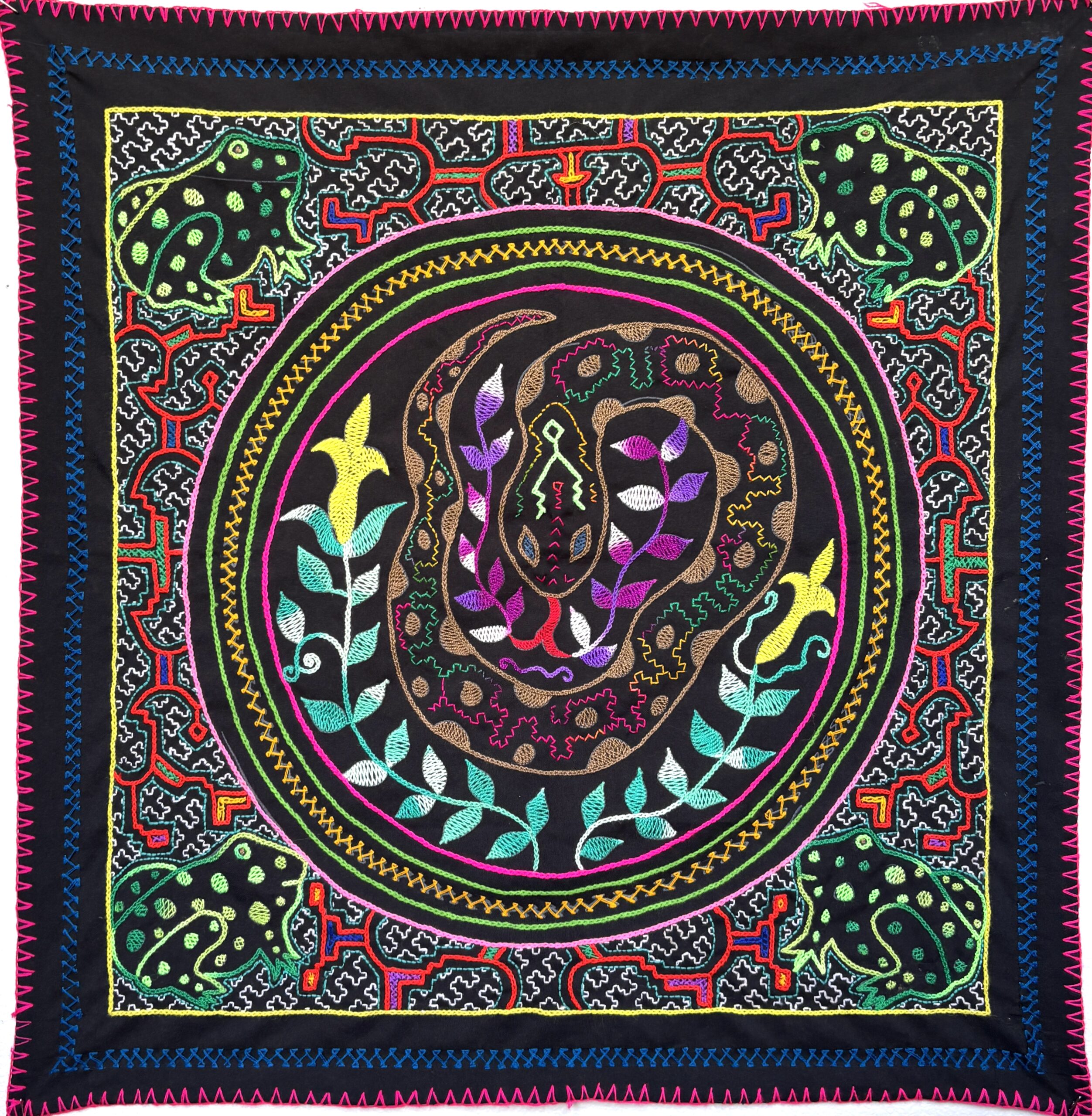 This one of a kind embroidered song cloth was handmade and designed by the Shipibo Conibo, who live in Peru, in the Ucayali River basin, a feeder for the Amazon River.