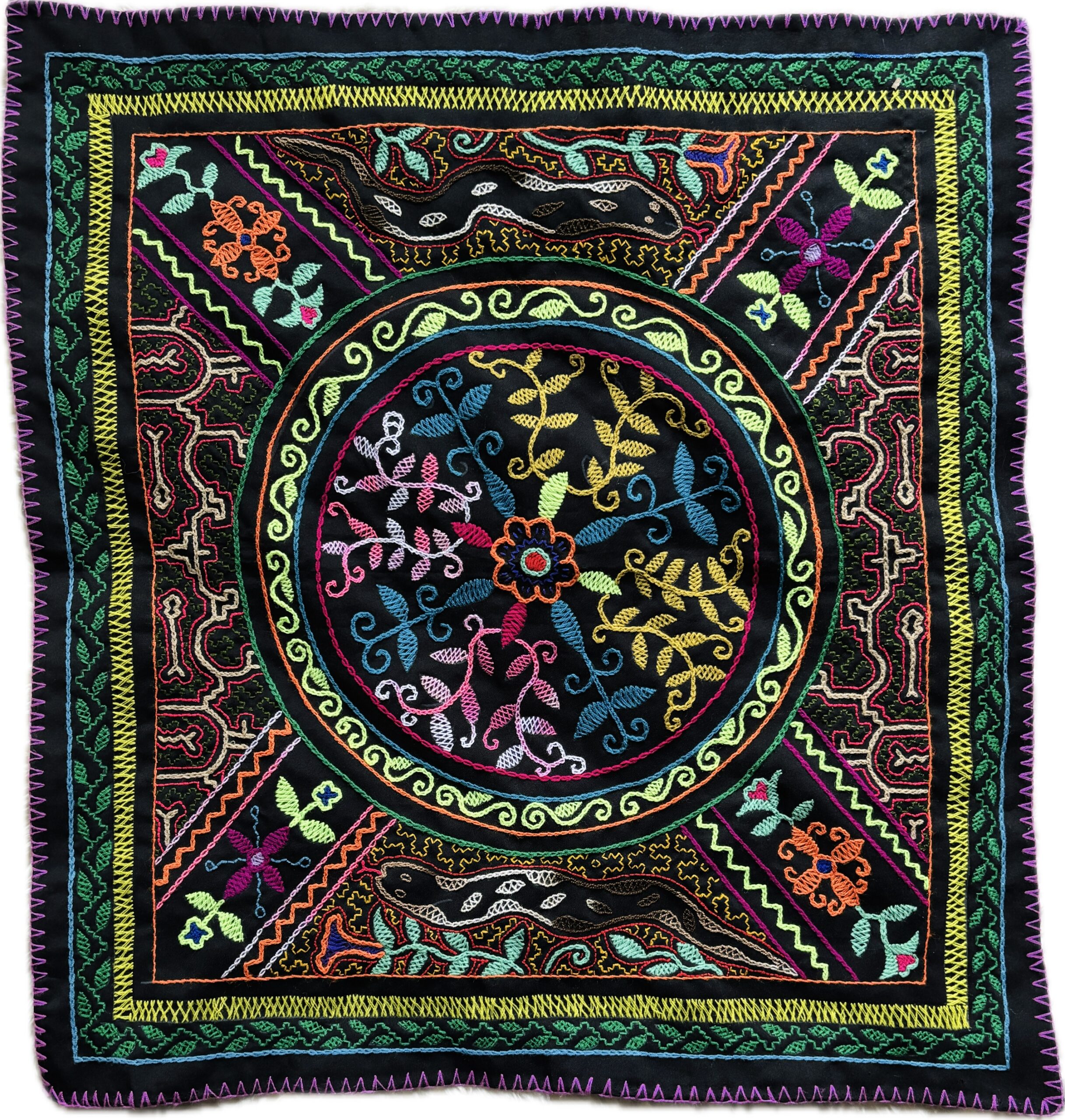 This one of a kind embroidered song cloth was handmade and designed by the Shipibo Conibo, who live in Peru, in the Ucayali River basin, a feeder for the Amazon River.