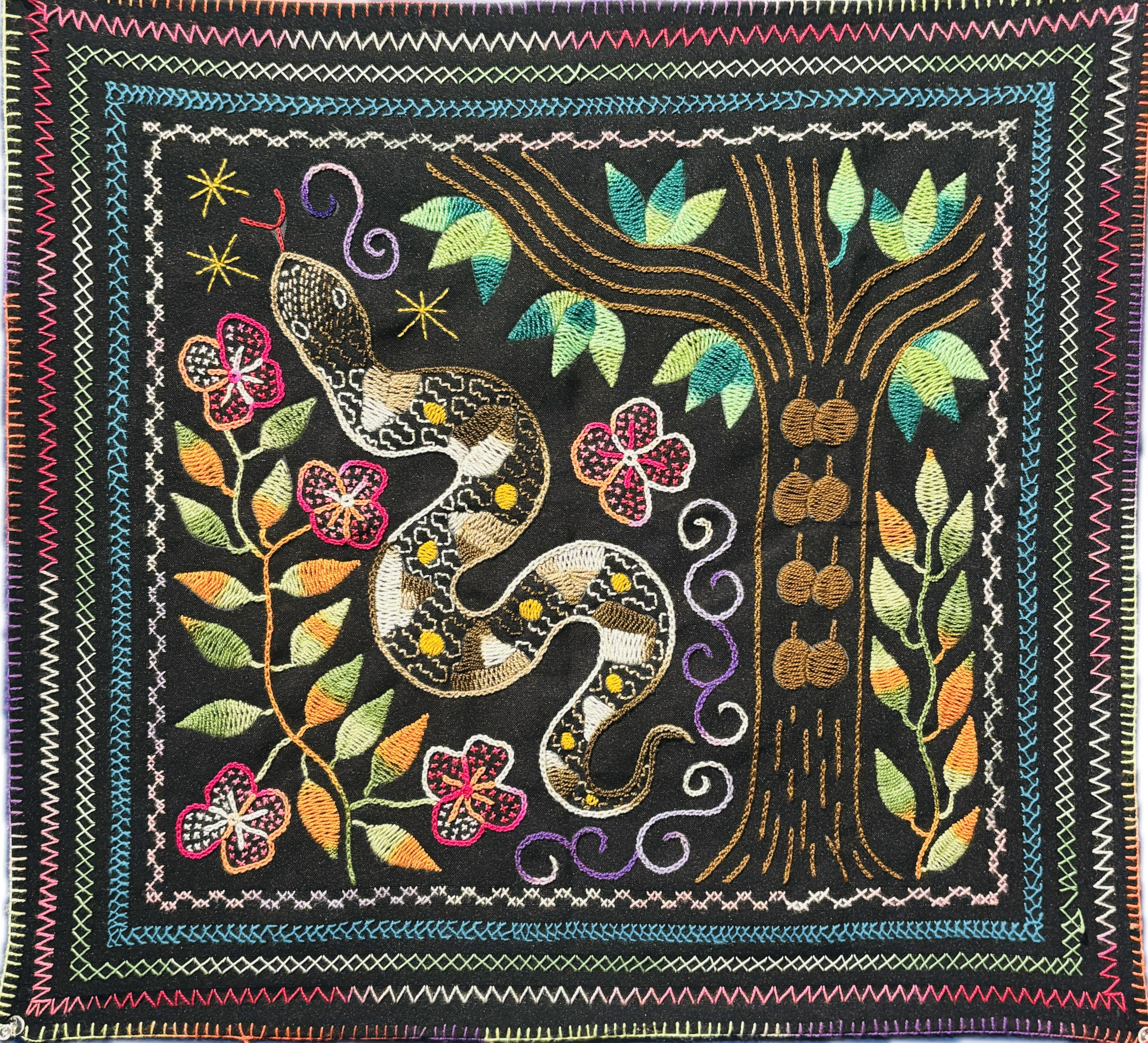 This one of a kind embroidered song cloth was handmade and designed by the Shipibo Conibo, who live in Peru, in the Ucayali River basin, a feeder for the Amazon River.