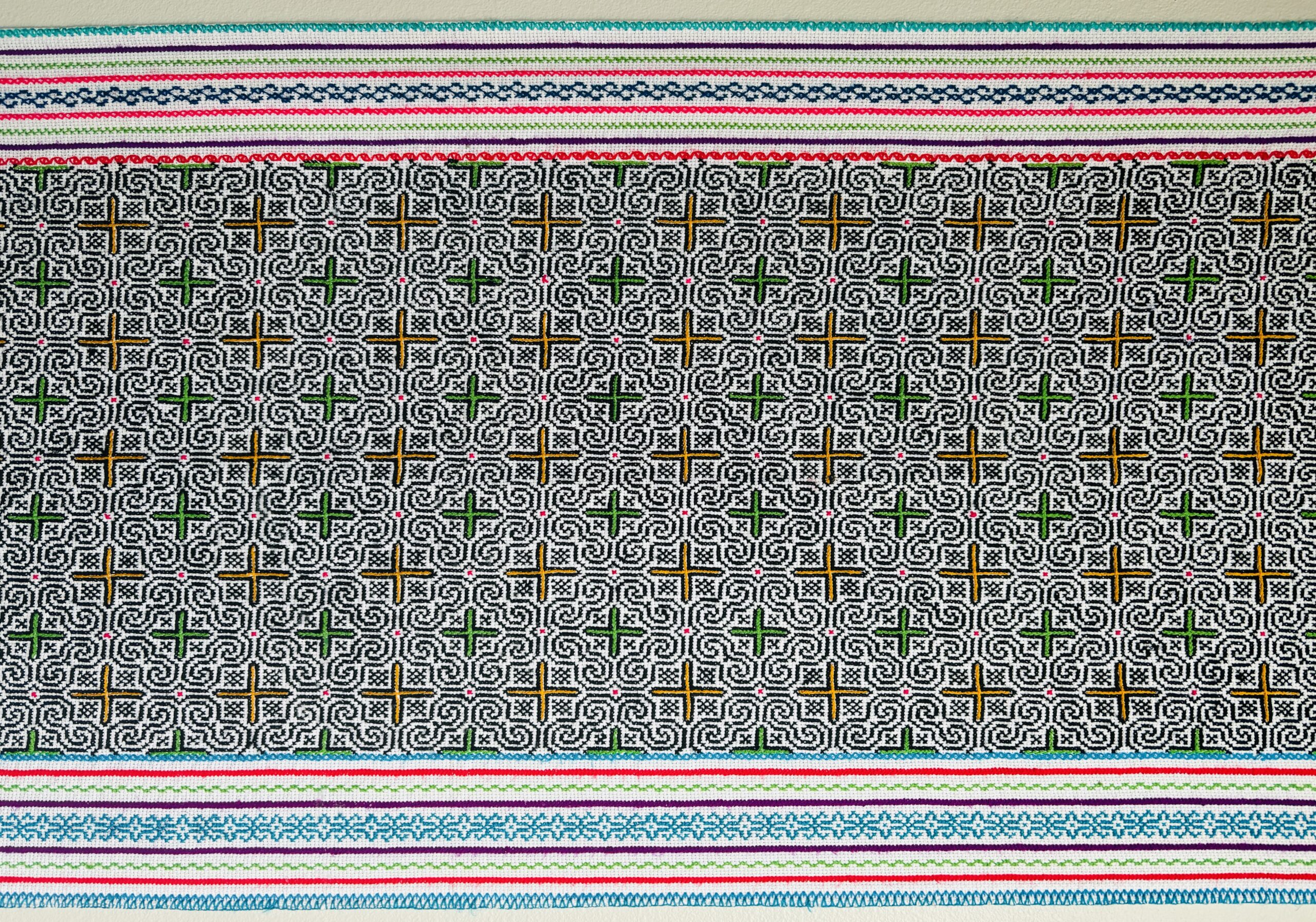 This one of a kind embroidered song cloth was handmade and designed by the Shipibo Conibo, who live in Peru, in the Ucayali River basin, a feeder for the Amazon River.