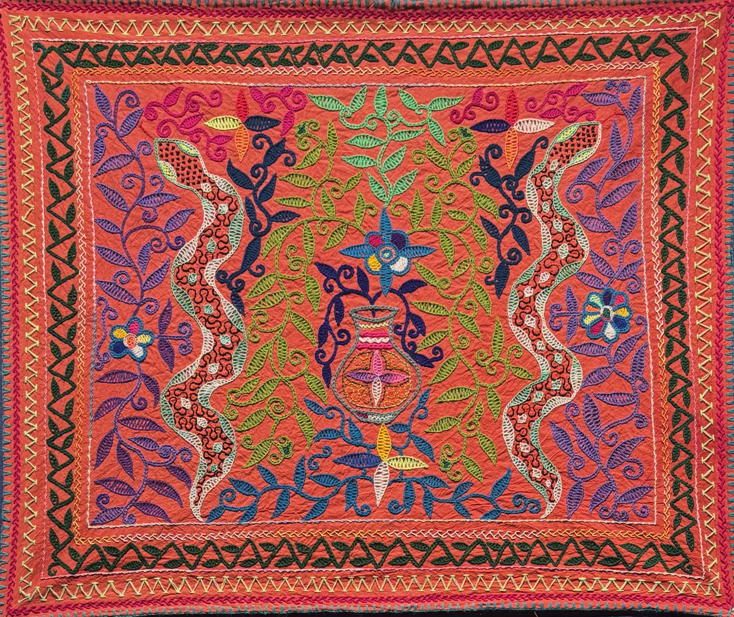 This one of a kind embroidered song cloth was handmade and designed by the Shipibo Conibo, who live in Peru, in the Ucayali River basin, a feeder for the Amazon River.