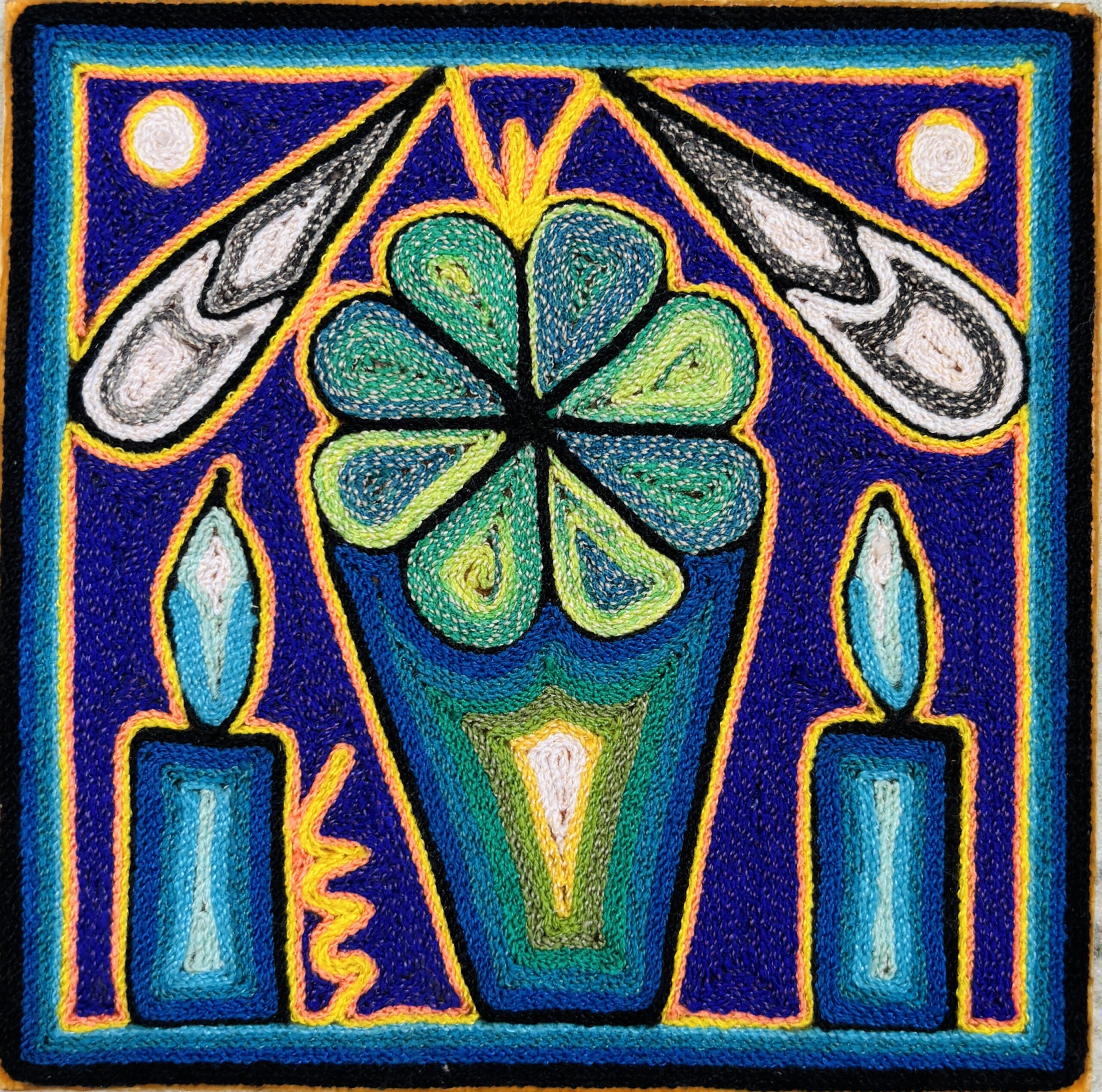 Velas, Plumas, y Hikuri – Candles, Feathers, & Hikuri; Wixarika Nierika Yarn Painting